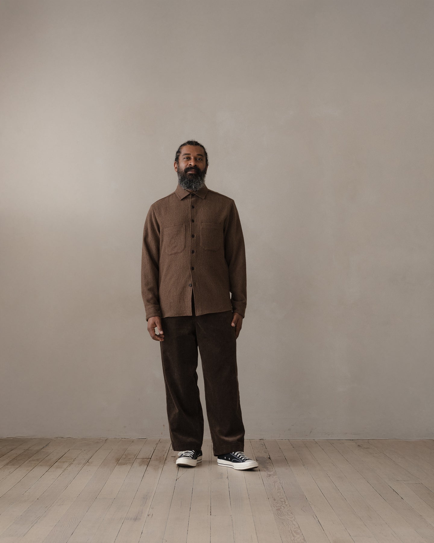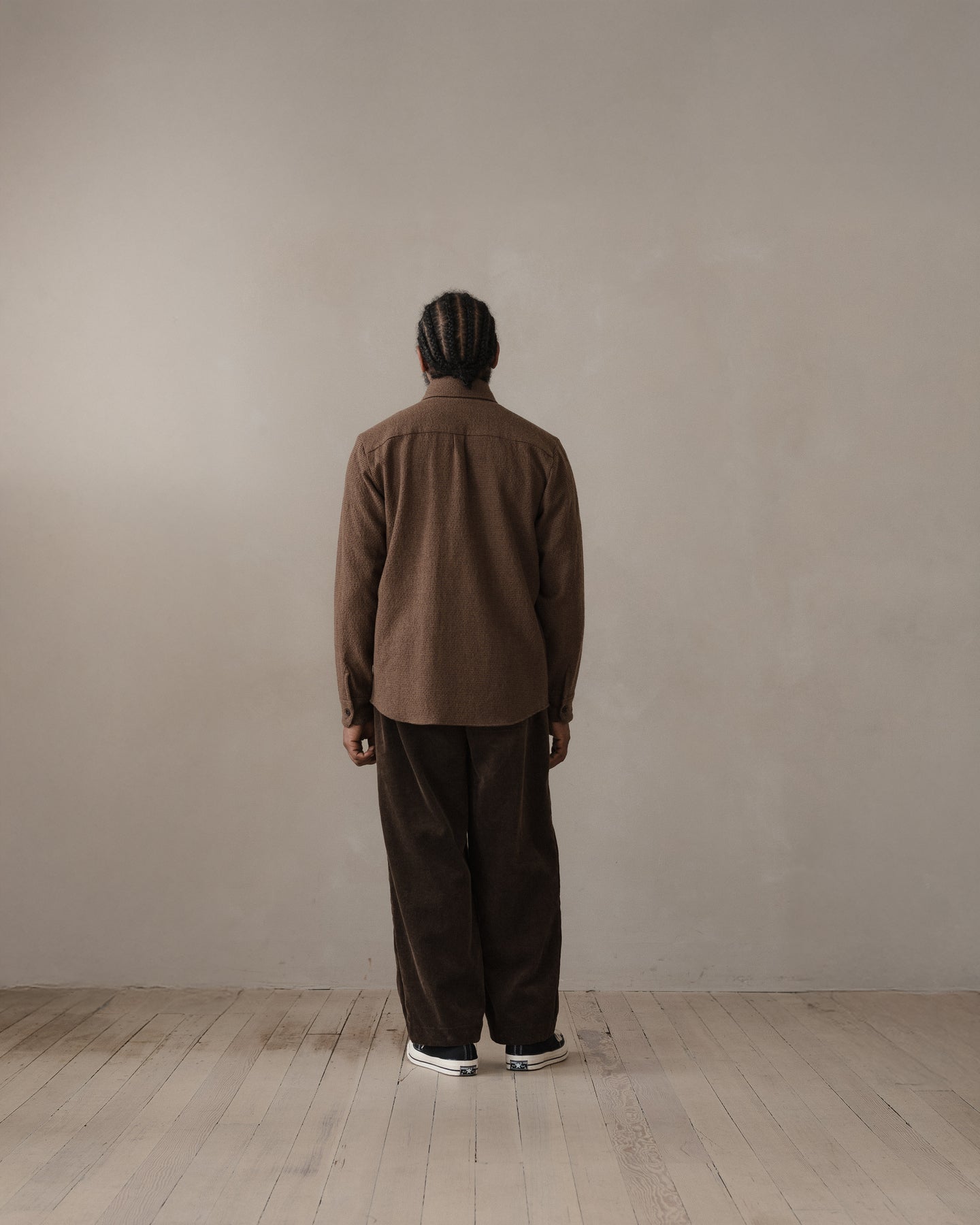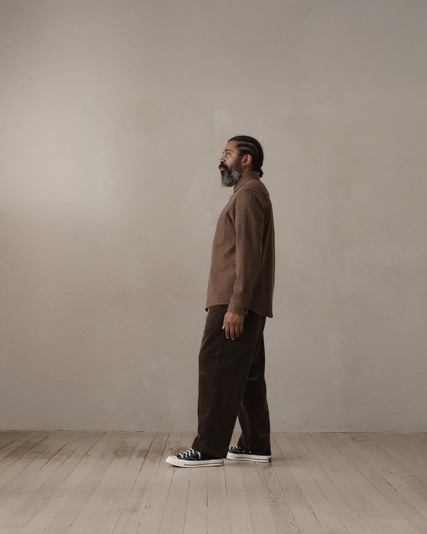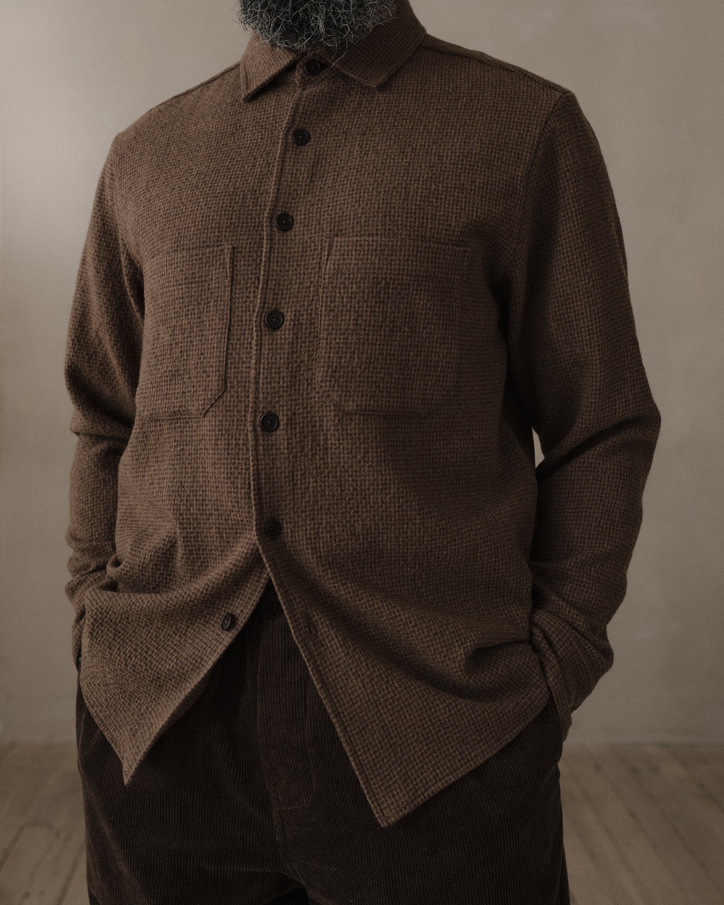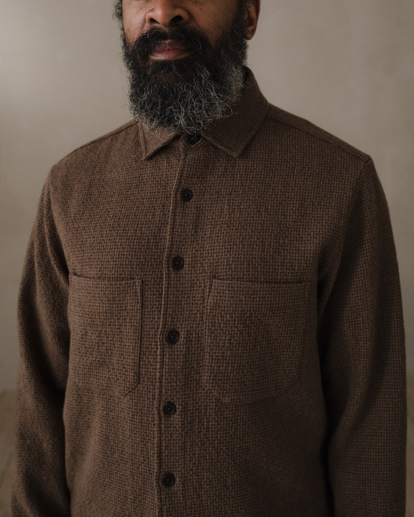 This yarn dyed wool & cotton blend puppytooth cloth was woven in Ichinomiya, Japan. The mixed fiber composition creates two different tensions in weaving resulting in a subtle puckered texture and soft hand. The effect was further exaggerated through washing and a tumble finish.
