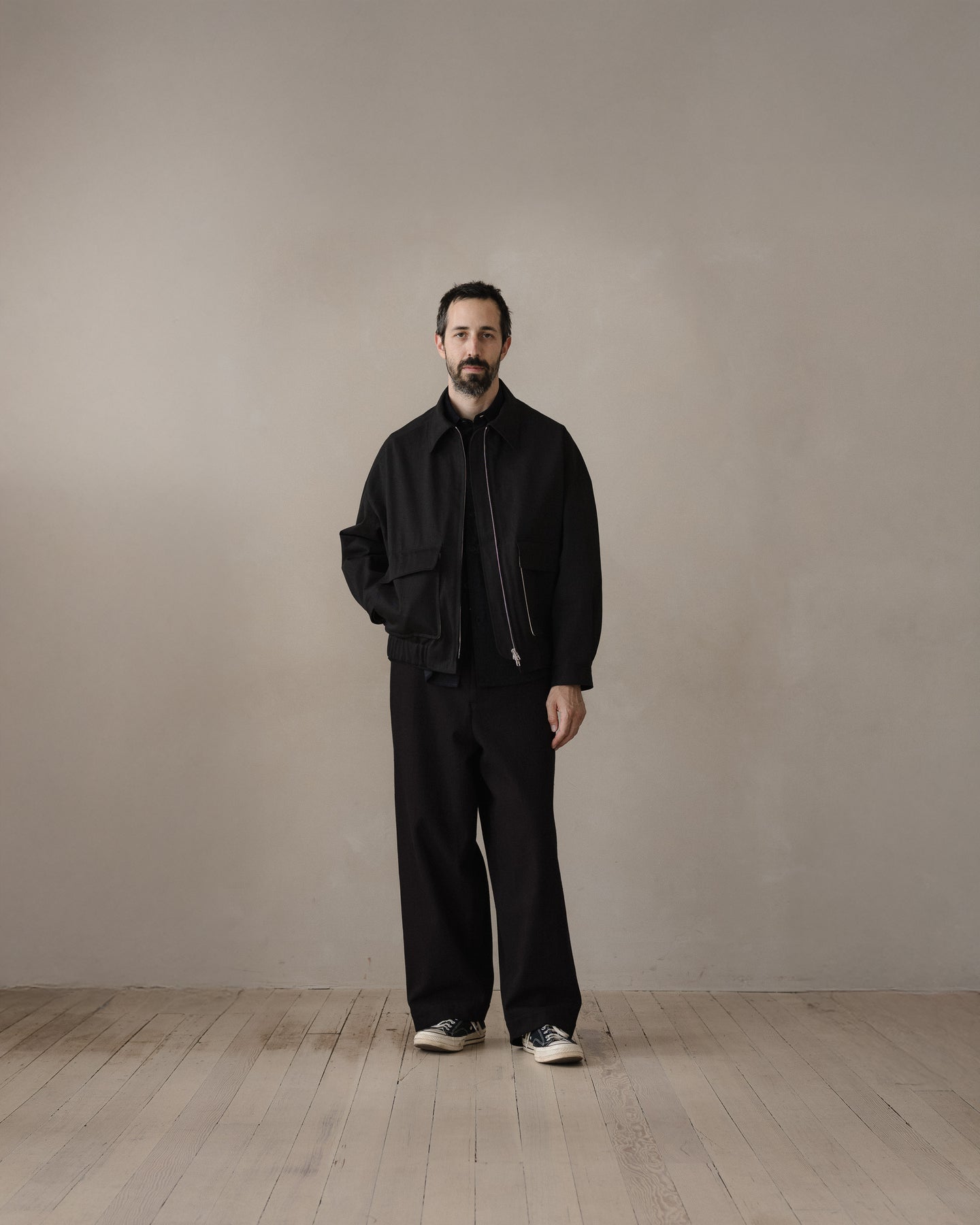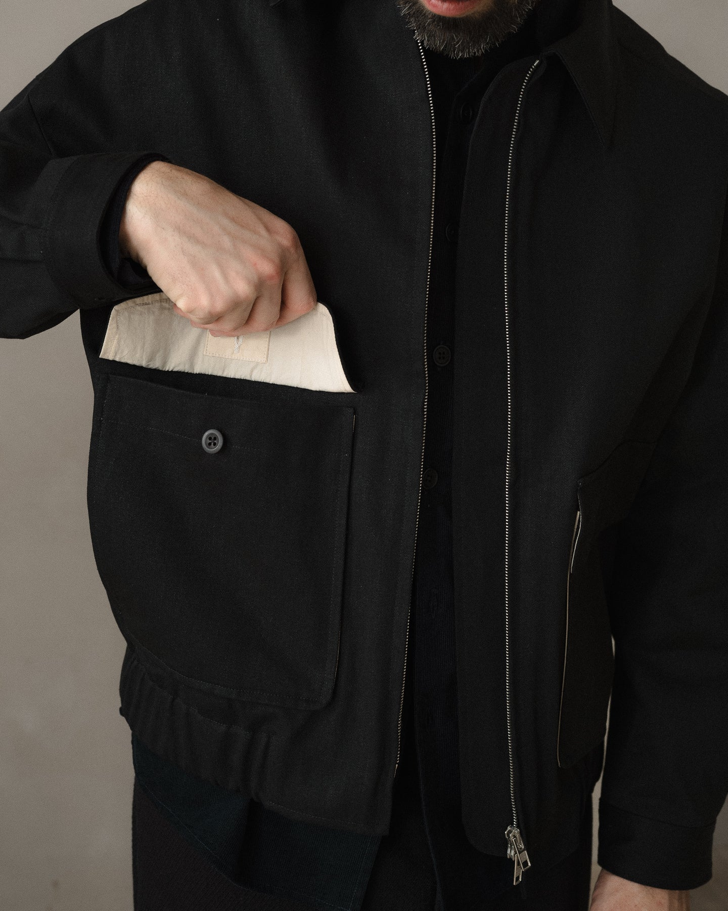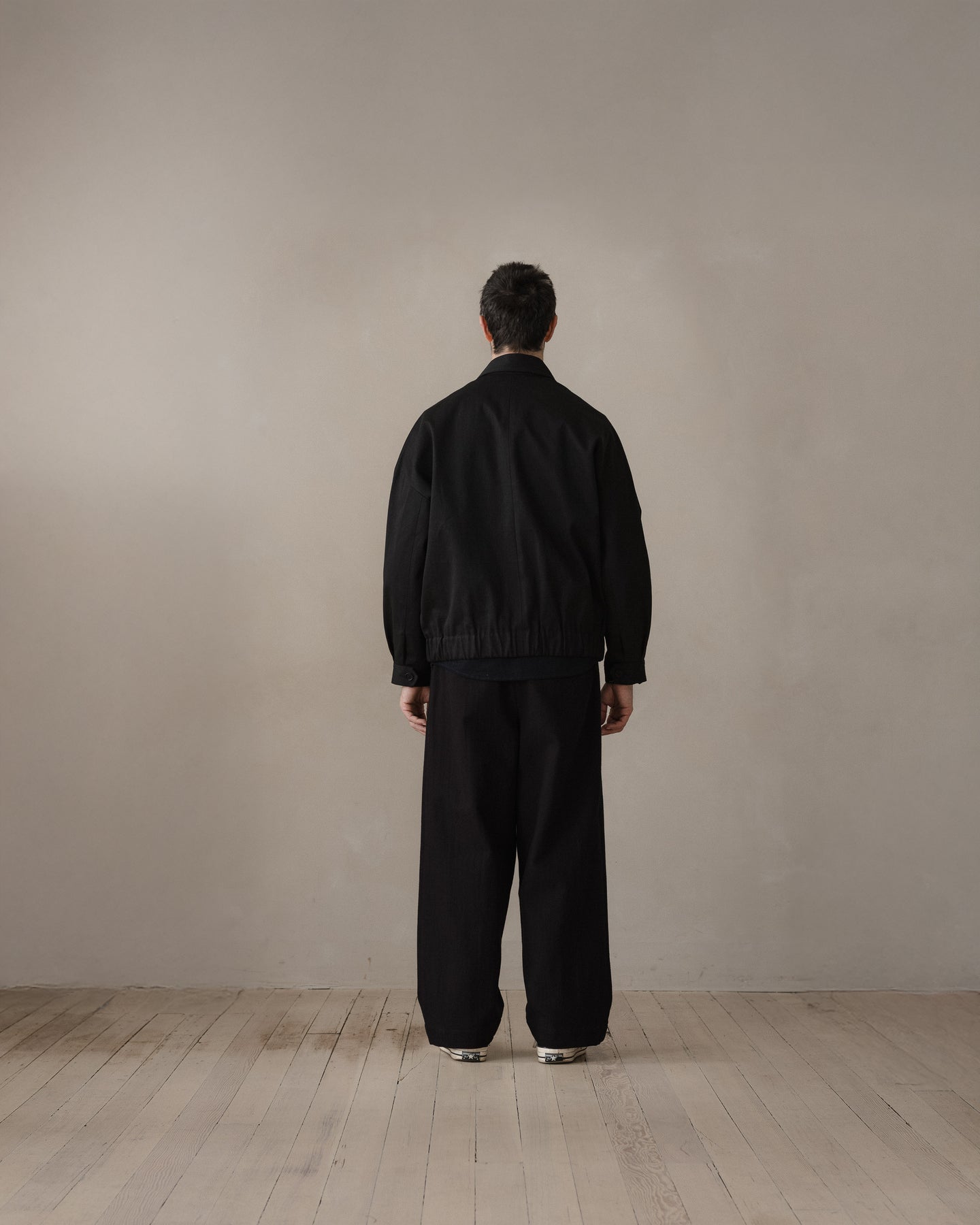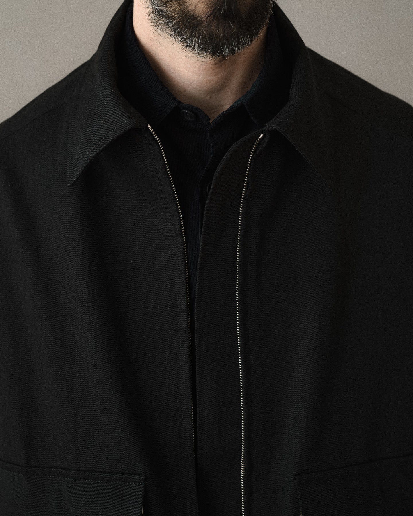 A fully lined loose, blouson style jacket with dropped shoulder seams, elasticated waistband, button through cuffs, large two-way flap pockets with hidden button closure, corozo buttons, two-way zipper, and pointed collar tips. The looser silhouette allows for comfortable layering beneath.