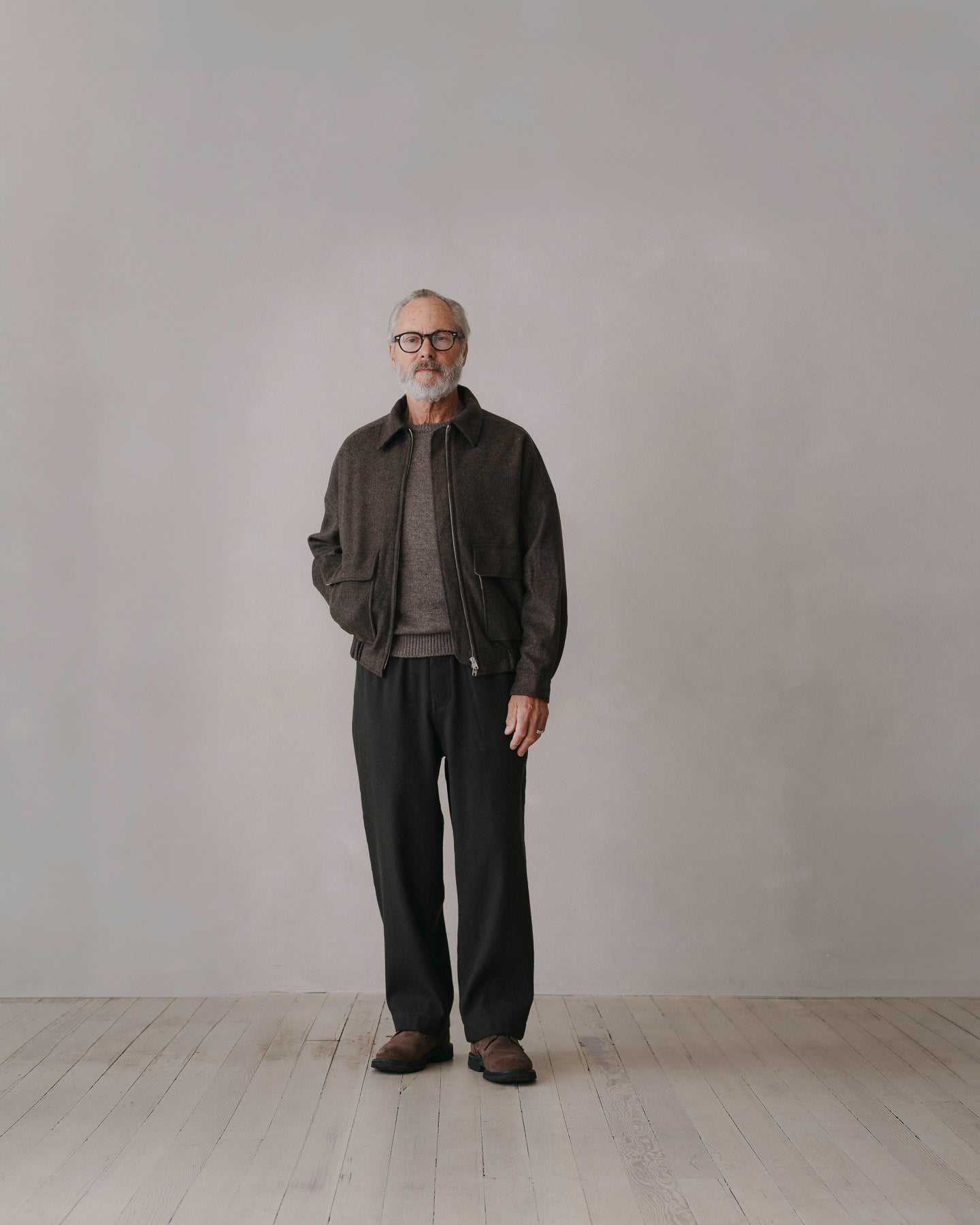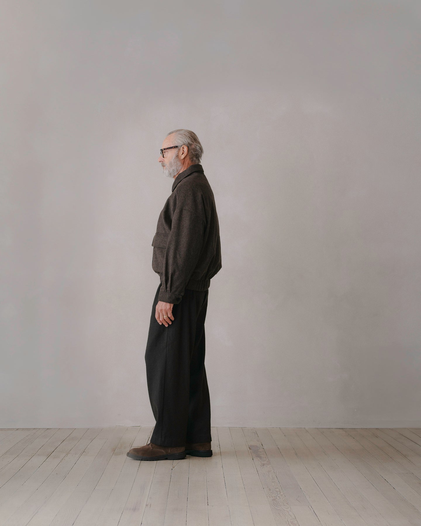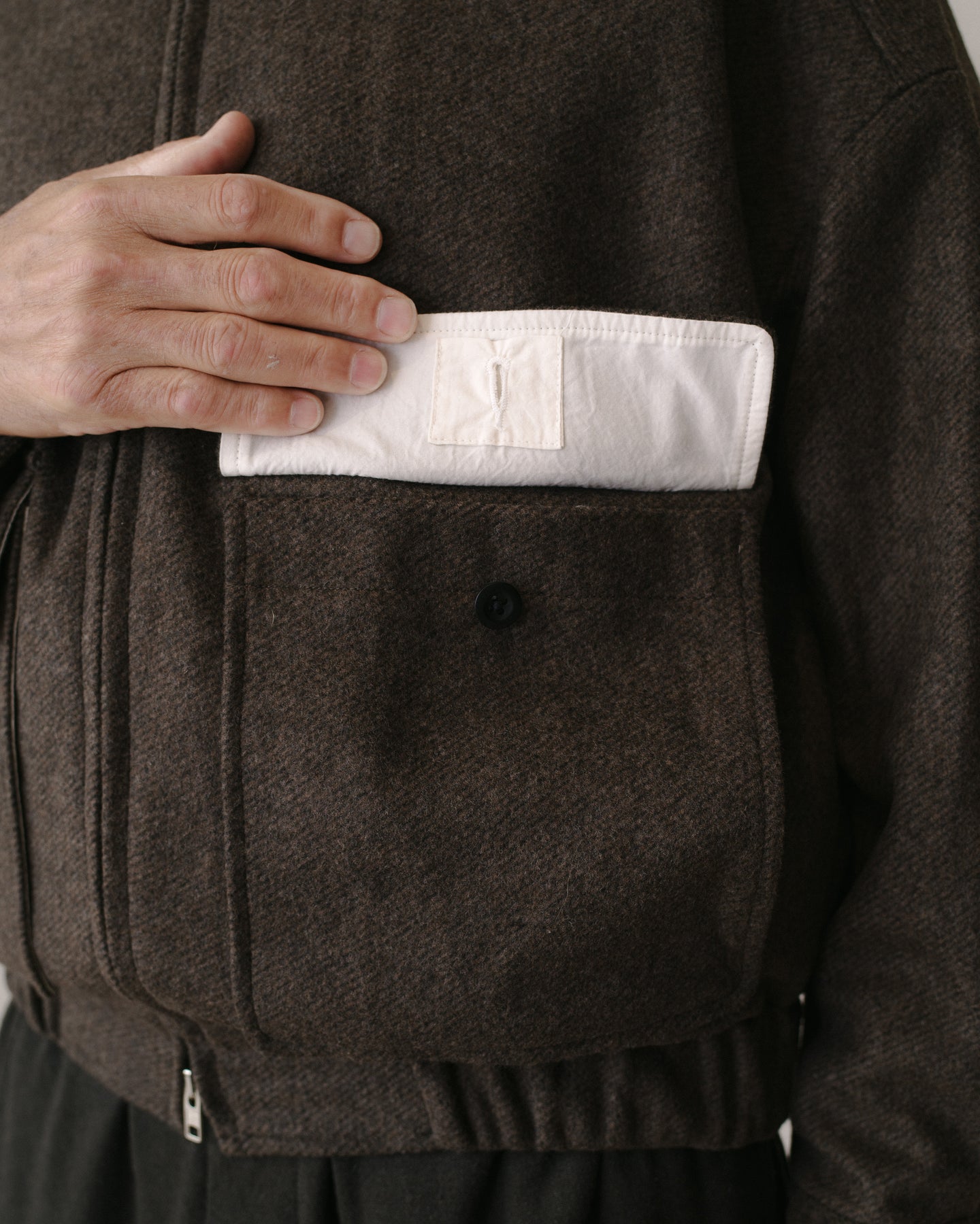 A fully lined loose, blouson style jacket with dropped shoulder seams, elasticated waistband, button through cuffs, large two-way flap pockets with hidden button closure, corozo buttons, two-way zipper, and pointed collar tips. The looser silhouette allows for comfortable layering beneath.
