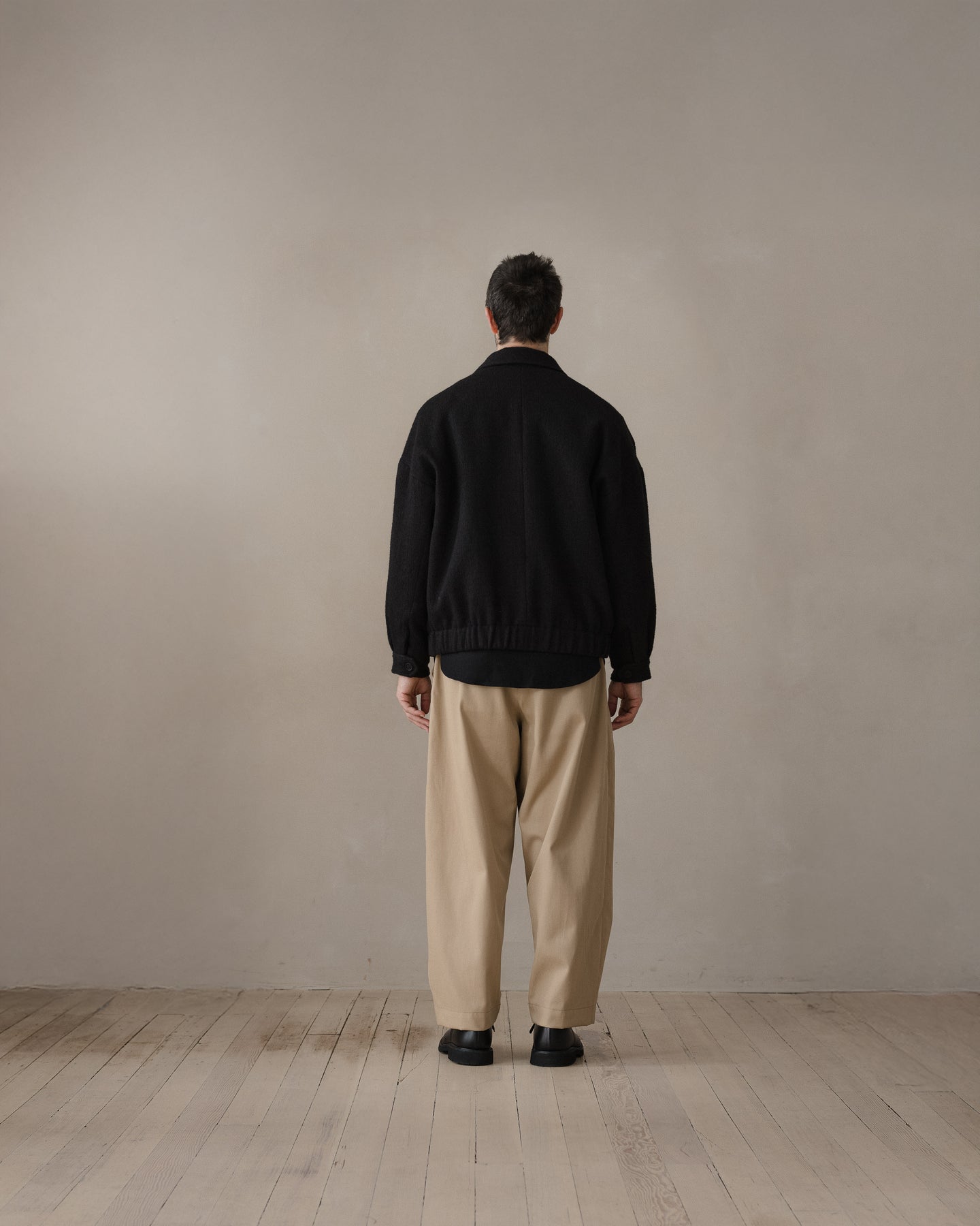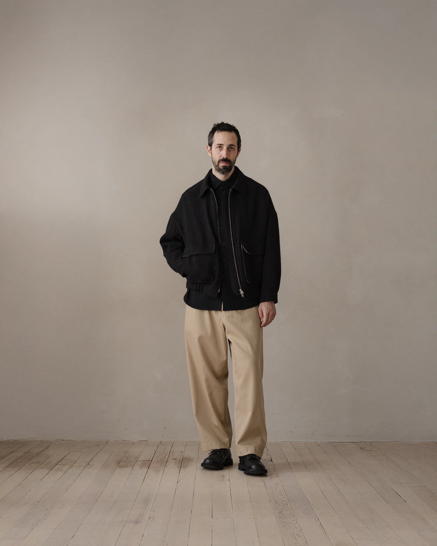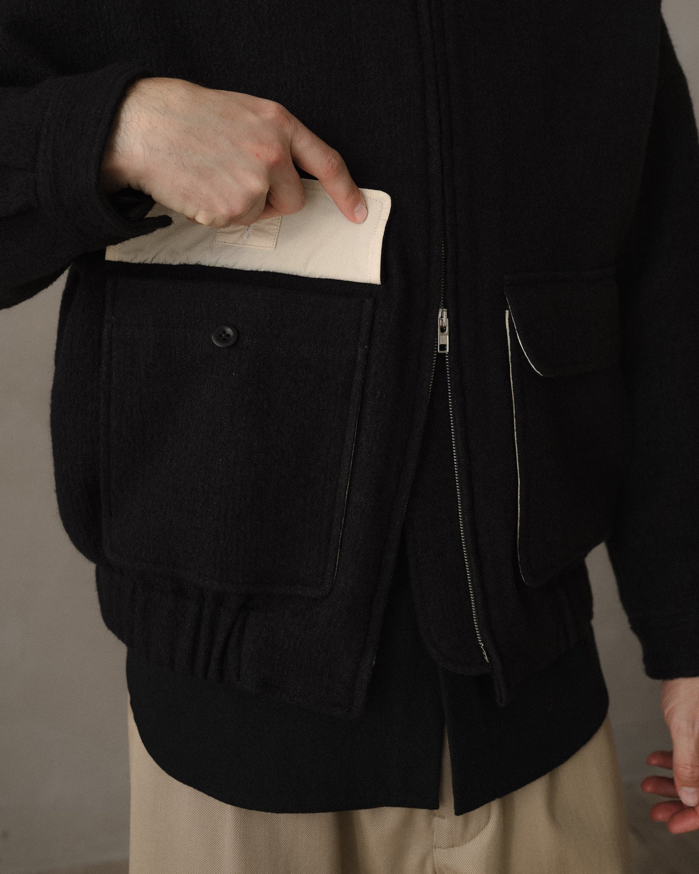 A fully lined loose, blouson style jacket with dropped shoulder seams, elasticated waistband, button through cuffs, large two-way flap pockets with hidden button closure, corozo buttons, two-way zipper, and pointed collar tips. The looser silhouette allows for comfortable layering beneath.
