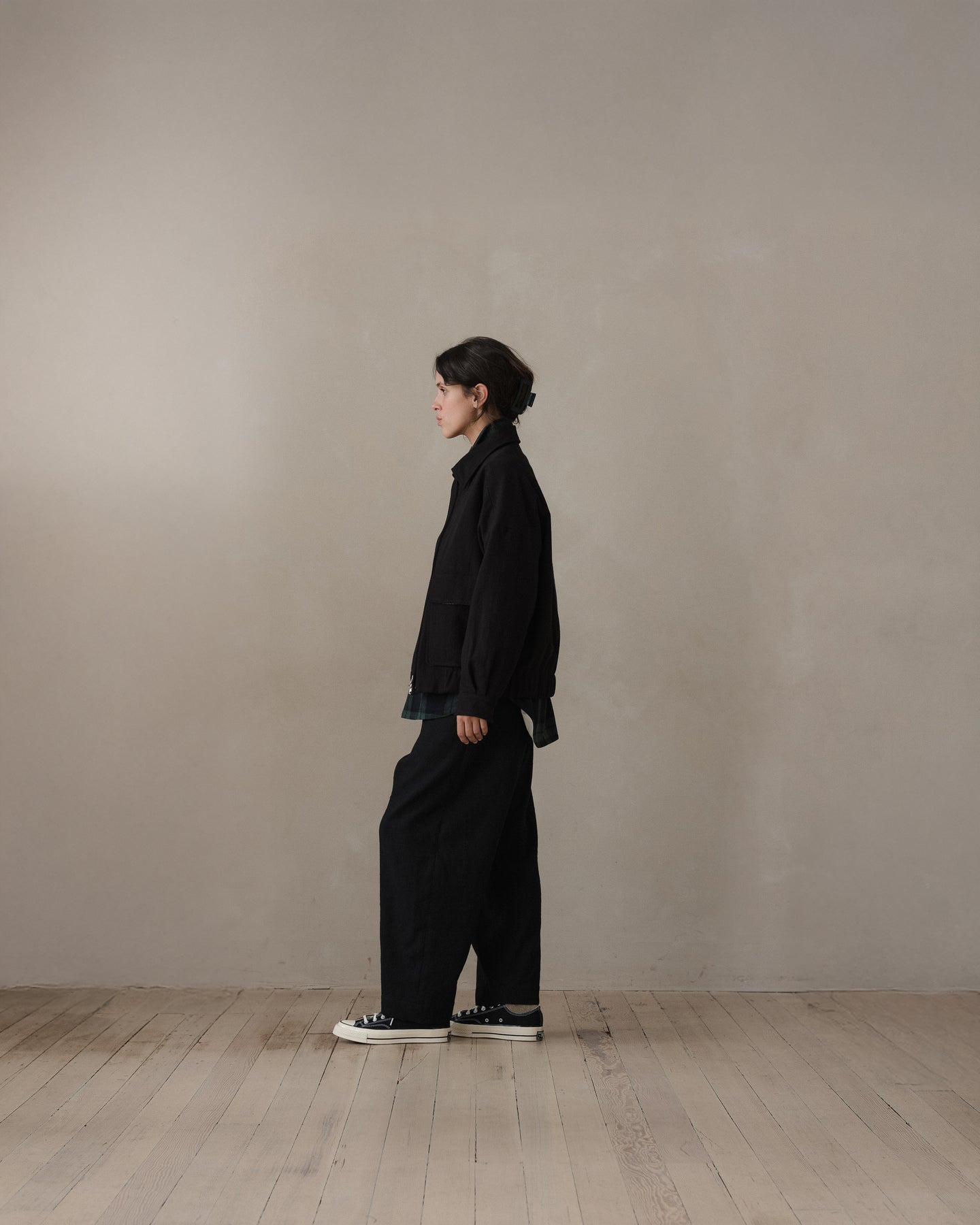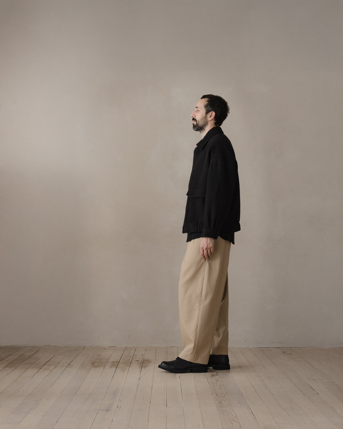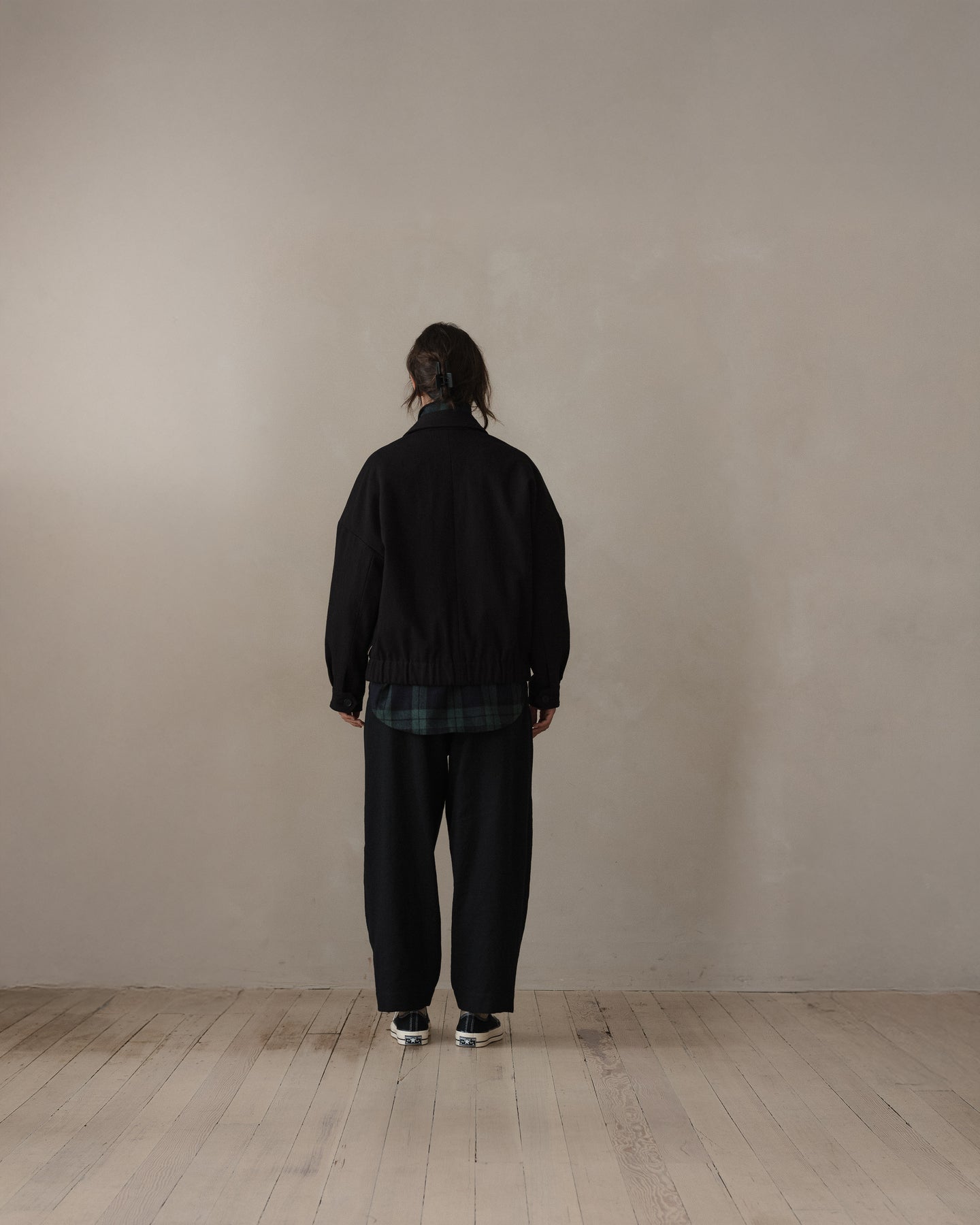 A fully lined loose, blouson style jacket with dropped shoulder seams, elasticated waistband, button through cuffs, large two-way flap pockets with hidden button closure, corozo buttons, two-way zipper, and pointed collar tips. The looser silhouette allows for comfortable layering beneath.