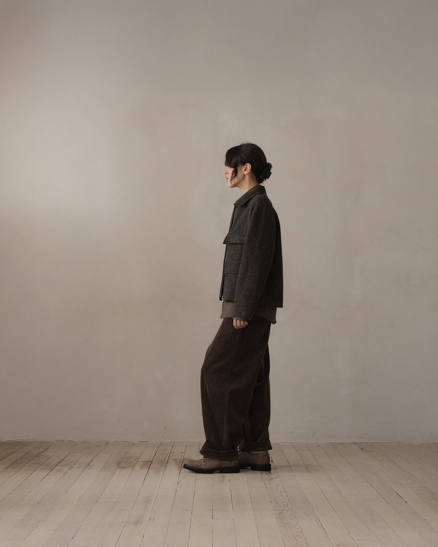 A slightly cropped, boxy fitting jacket, allowing for comfortable layering beneath - with cuff cinch tabs, large dropped two-way chest pockets with hidden button closure, corozo buttons, two-way zipper, and pointed collar tips.